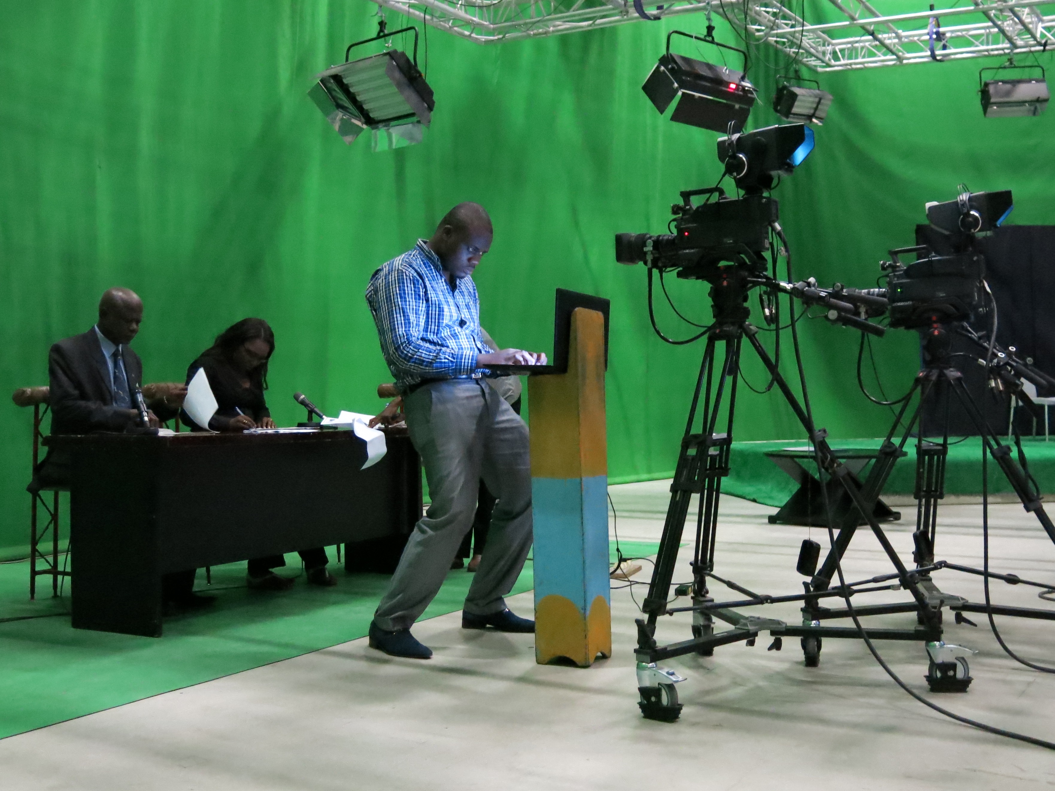Ein paar Zimmer weiter sitzt der Assistent der Direktorin in seinem Büro. Auf seinem Schreibtisch türmt sich stapelweise Papier. Lange würde es hier nicht mehr so aussehen, entschuldigt er sich für den Zustand des maroden Gebäudes. Bald werde es saniert werden. Die privaten Konkurrenz hätte viel investiert in neue Studios, Kameras und Ausbildung. Da müsse das Staatsfernsehen mitziehen.