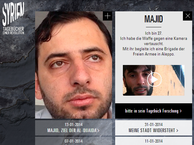 Unter dem Film gibt es einige interessante Zusatzinfos: ein zusammenfassender Text, eine Fotostrecke, ein paar Fakten und ein Interview (Nur die Kommentarfunktion scheint schlecht moderiert zu sein). Vor allem aber führt ein Link zu den „Tagebüchern einer Revolution“ – einer beeindruckenden Dokumentation der Dokumentation. Die einzelnen Videoschnipsel, die Oussama, Majid und Amer in den vergangenen eineinhalb Jahren aufgenommen haben sind dort zu einer detaillierten Chronik aufgeführt. Man kann sich durch den Zeitstrahl navigieren, einem der Aktivisten im einzelnen folgen oder die Kapitel des Widerstands öffnen. Das ist nicht nur aus journalistischer Sicht ein spannendes „Making of“. Es offenbart auch Details über den bewegenden Kampf der Männer, Bilder und Eindrücke, die es nicht ins Video geschafft haben. Die Vielzahl erschlägt, könnte man einwenden. Was einen aber eigentlich fertig macht, ist der Umstand, dass sie nach eineinhalb Jahren immer noch Videos einsenden müssen, um diesen Krieg zu zeigen .